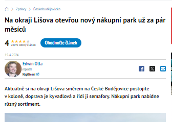 Dne 19.4.2024 vyšel článek o našem projektu v Lišově s názve Na okraji Lišova otevřou nový nákupní park už za pár měsíců.